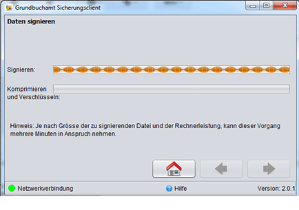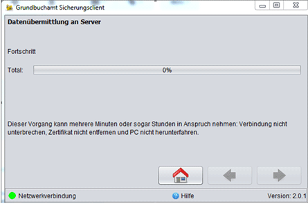 Nach dem Signaturvorgang beginnt der Grundbuch-Sicherungsclient automatisch mit dem Hochladen der Daten. Dabei werden die Daten zweifach verschlüsselt und an den Server übertragen. Dies kann mehrere Stunden dauern. Lassen Sie den Vorgang im Hintergrund laufen und achten Sie darauf, dass der PC nicht abgeschaltet wird oder in den Schlafmodus fällt. Sie können gut an etwas anderem arbeiten, die Leistung des PCs wird durch die Übermittlung kaum beeinträchtigt.