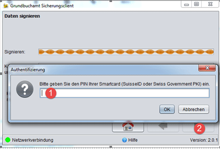 Sie müssen nun die Daten signieren. Damit wird technisch sichergestellt, dass die Daten später nicht unbemerkt verändert werden können. Das geht so: Geben Sie dazu den PIN Ihrer SuisseID oder des Klasse B-Zertifikats ein (1) und klicken Sie auf weiter (2).