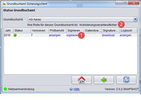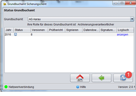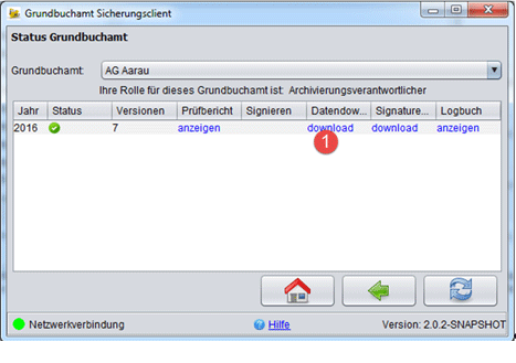 Im GBS wird die zuletzt gesicherte Version der Grundbuchdaten pro Jahr angezeigt. Diese kann nach einer Anmeldung (GBS starten, "Anmelden", "Status Grundbuchamt") mit Klick auf "download" (1) heruntergeladen werden.