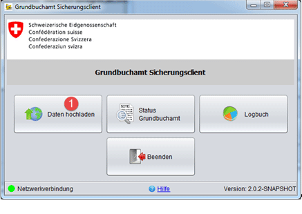 Tipp: Stellen Sie sicher, dass Ihr PC nicht frisch gestartet werden muss (z. B. keine zwingenden Updates pendent). Beginnen Sie mit dem Hochladen der Grundbuchdaten gemäss dieser Anleitung als erstes am Morgen, diese Tätigkeit beansprucht wenig Leistung Ihres PCs, Sie können somit wie gewohnt arbeiten. Entfernen Sie während dem Hochladen nie das Zertifikat und unterbrechen Sie nie die Internetverbindung (Sperren des PC bei Verlassen des Büros durch gleichzeitiges Drücken von "Ctrl"+"Alt"+"Del", danach "Enter").