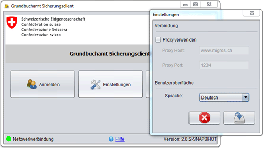 In der Regel werden Proxy und Sprache automatisch erkannt. Falls dies bei Ihrer Konfiguration nicht funktioniert, können Sie unter "Einstellungen" Angaben ändern oder ergänzen und speichern.