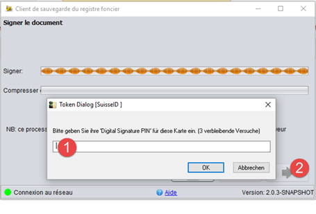 Vous devez maintenant signer les données, pour garantir qu’elles ne seront plus modifiées par la suite. Saisissez le NIP de votre SuisseID ou de votre certificat B (1) puis cliquez sur "continuer" (2).