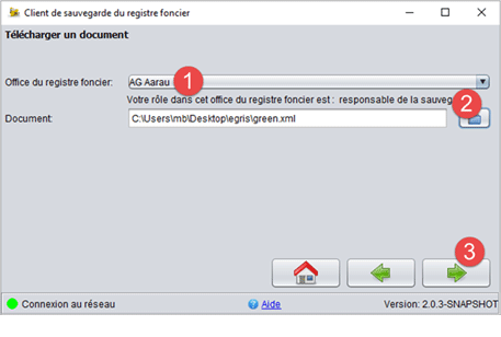 Cliquez sur le symbole du dossier (2) pour choisir le document établi par votre logiciel du registre foncier et le télécharger. Cliquez ensuite sur "continuer" (3).