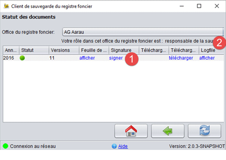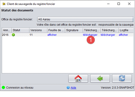 La dernière version sauvegardée des données du grand livre de chaque année apparaît dans le client de sauvegarde. Une fois connecté (ouvrir le client de sauvegarde, "Se connecter", "Statut des documents"), il est possible de la télécharger en cliquant sur "télécharger" (1).