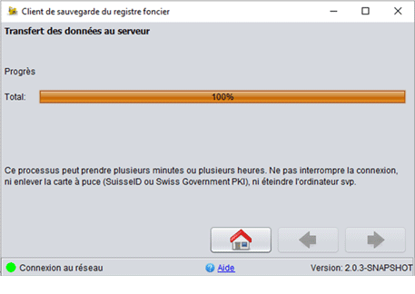 Le contrôle par l’OFJ peut durer plusieurs heures. Vous pouvez vous connecter de nouveau plus tard (ouvrir le client de sauvegarde, "Se connecter", "Statut des documents").